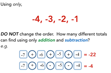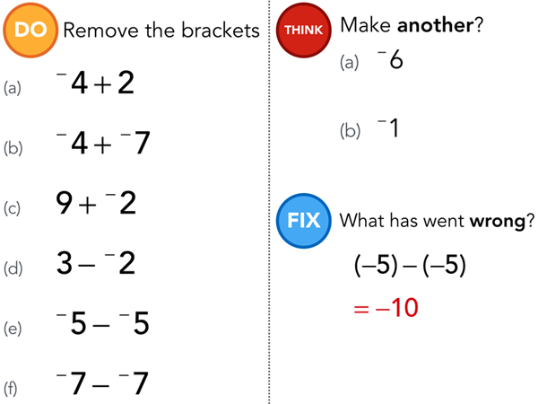 In the example above we use the additive inverse property as a basis for what we usually refer to as subtraction; pupils love the conversation I have at this point to hook them in about ‘take-away’ and subtraction not being a ‘real thing’. We are proper mathematicians now and we only work with two operations: addition and multiplication. Again, like with addition, example-problem pairs are utilised and ‘make me another’ prompts but before I move to more demanding questions I like to check for understanding or more replication at this point and offer something like this:
