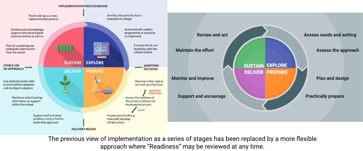 EEF’s 2019 update to “A School’s Guide to Implementation” defined implementation as a process with stages set out in a very rigid, linear structure. The new guidance takes a different approach, representing Explore, Prepare, Deliver, Sustain as phases, subtly shifting their scope to enable greater flexibility in how leaders think about implementation.